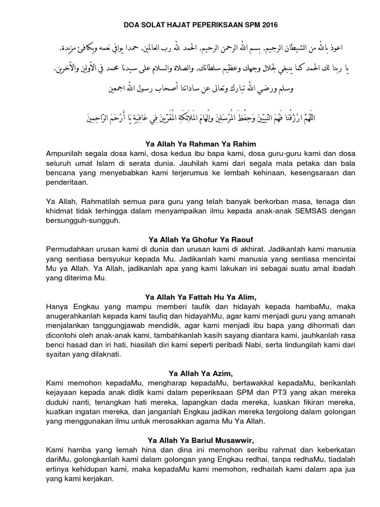 Panduan Dan Doa Solat Hajat Untuk Peperiksaan Spm Dikongsikan Khas Bagi Pelajar Tingkatan 5. Salah satu perkara yang paling tertekan yang dihadapi oleh remaja ialah peperiksaan. Minta dan bayangkan kejayaan dalam doa.